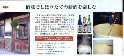 酒蔵でしぼりたての新酒を楽しむ 1時間30分 俳優、佐々木蔵之助氏の実家である「佐々木酒造」 2,000円