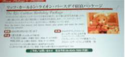 ホテルで見つけた素敵な企画 その1 リッツカールトン・ライオン・バースデー宿泊パッケージ ホテルは多種多様な企画を発信する。基本的には企画立案する人が、自分も利用したいと思う企画がいい。 私がホテルに勤めていた頃、毎月イベント情報誌を作成して顧客などに発信していた。現在はほとんどのホテルは2ヶ月に1度となっている。経費的な問題かネタがないのかは定かではない。 私はホテルに寄ったときに企画のリーフレットをすべて貰って来る。それを、自宅でじっくり読んでみる。 大阪梅田にあるザ・リッツカールトンが発行する、ザ・ニューズレター12月1月号から素敵な企画を見つけたので紹介する。