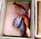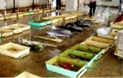 箱ごとに競りが行われるそうだ。箱の中身を覗いてみた。 「きゃー、熱帯魚だ」この箱だけ南国っぽいのです。どの箱も新鮮そのもの。 生のキハダマグロやシイラなどの大型魚も売られる。